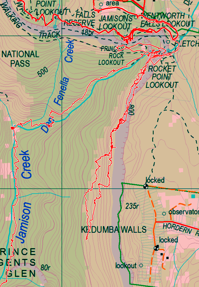 Kedumba Walls Tallus track came from an idea I found in Jim Smith's book on the Lindeman Pass. His idea was to circumnavigate the Jamison valley without the use of public roads. Currently for the section between Wentworth Falls and Kedumba Pass there are 2 explored options. The first involves using Kedumba Pass and and Tablelands Rd to connect up with the tracks from Rocket Point (including Little Switerland gully). The second is to follow the route down Jamison Creek as described on this site. Neither in my opinion are satisfactory. So I decided to give a go at finding a way along the bottom of Kedumba Walls.